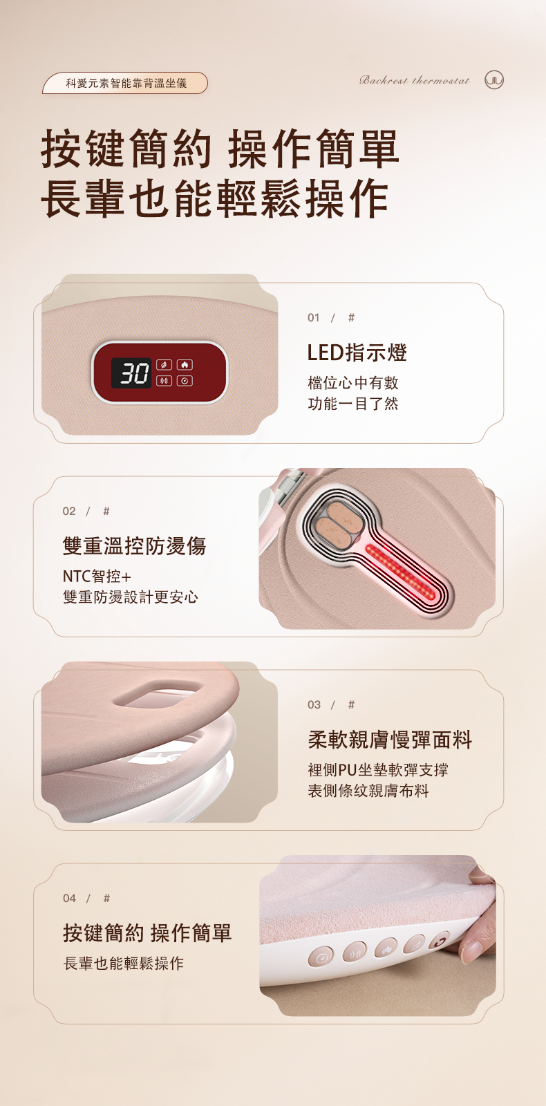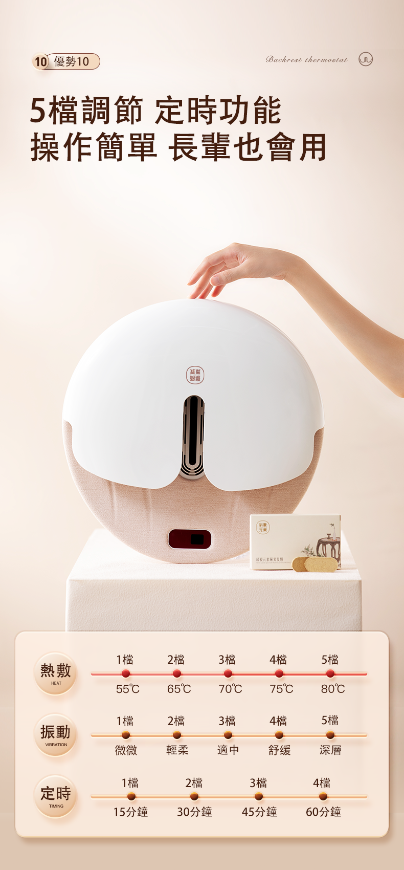 》多檔位震動按摩調節、多檔位加 熱調溫磁療、自動定時調節等功能